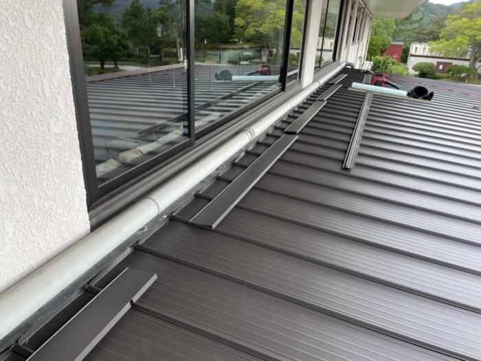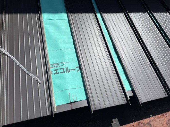 0.4ミリの材料で、たてひら葺きの下屋根をシングルの上からカバー工法で葺きました。